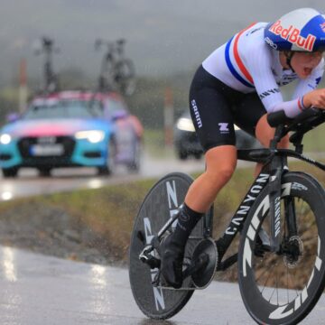 La británica Zoe Bäckstedt, primera líder de la Vuelta a Extremadura femenina tras imponerse en la crono de Herrera del Duque Infoprovincia, marzo 6, 2026