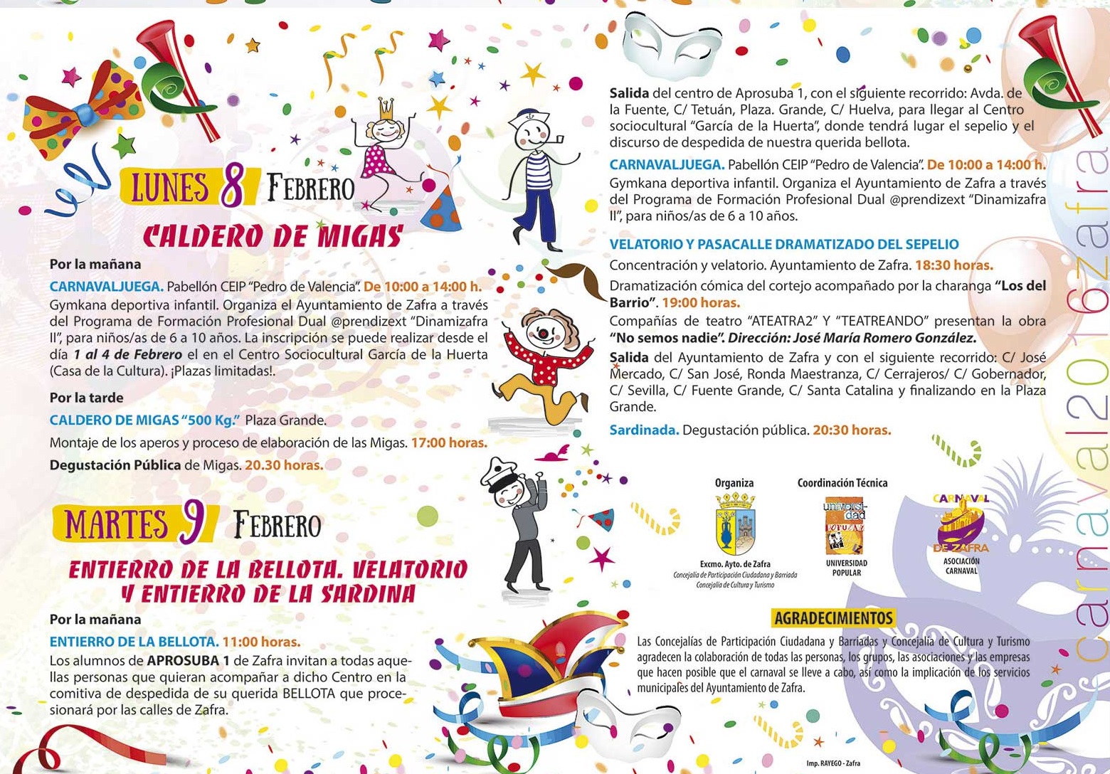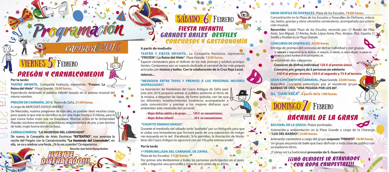 El Ayuntamiento, a través de la Concejalía de Festejos y Participación Ciudadana y de la Universidad Popular, ha presentado el programa de actividades del Carnaval de Zafra que se celebrará del 5 al 9 de febrero con gran variedad de actividades: pregón y Carnalcomedia, pasacalles, concursos, la Bacanal de la Grasa, la elaboración de las migas y el entierro de la sardina. Como novedad habrá variedad de actividades dirigidas a los más jóvenes.