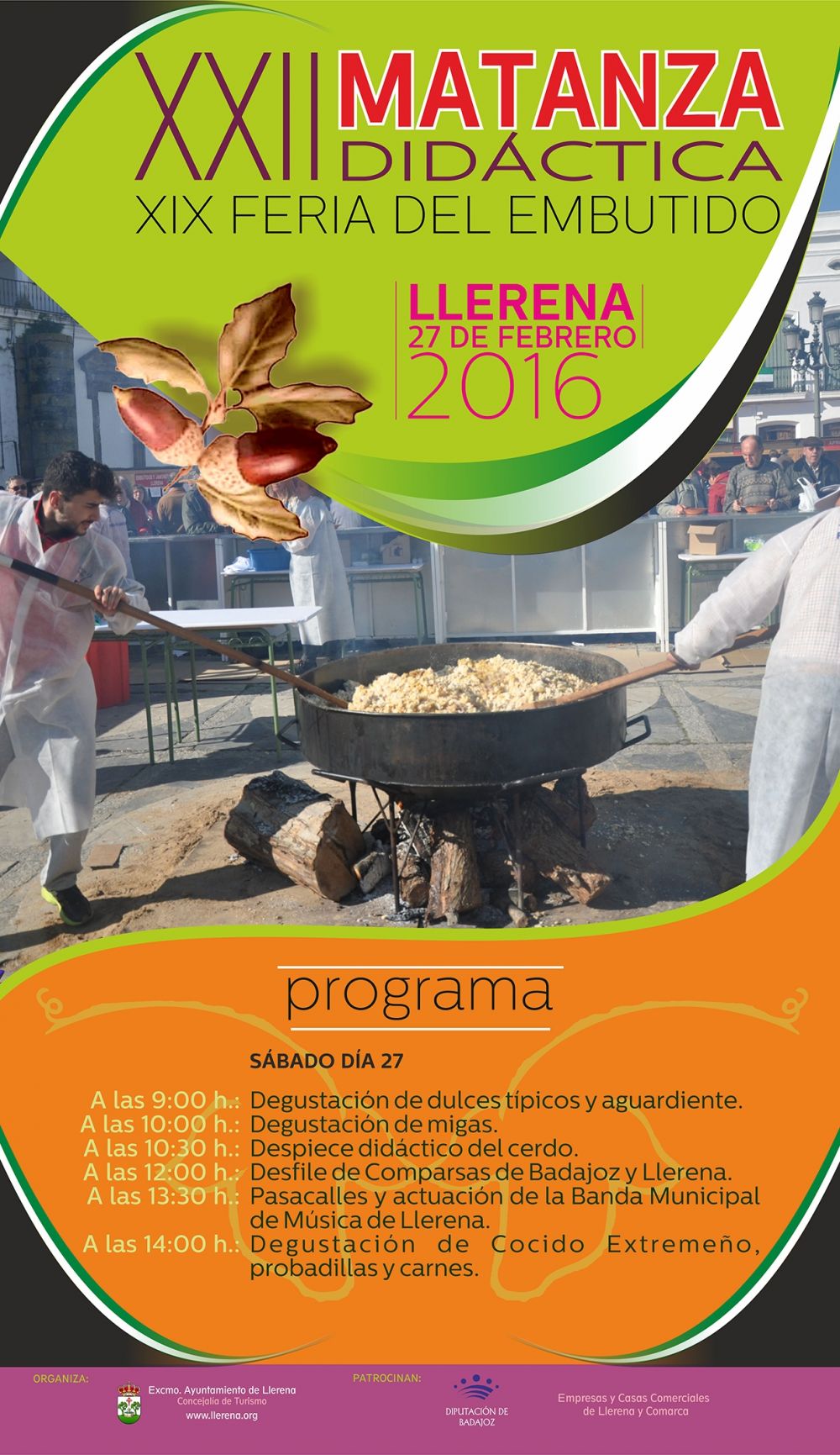 La matanza comenzará a las 9:00 horas con la degustación de dulces típicos y aguardiente para seguidamente saborear las tradicionales migas. A continuación, se procederá al despiece de dos de los 11 cerdos sacrificados para la jornada. Habrá desfile de comparsas de Badajoz y Llerena, además de pasacalles y actuación de la Banda Municipal de Música de la localidad. La jornada matinal finaliza con la degustación de cocido extremeño, probadillas y carnes.