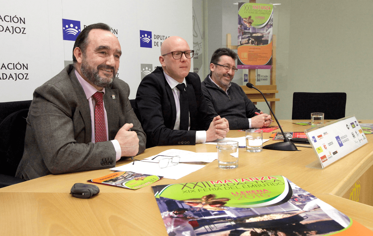Acompañado por el diputado Desarrollo Local, José Ángel Benítez, y el primer teniente de alcalde, José Castaño, Cortés detalló la XXII Matanza Didáctica y XIX Feria del Embutido que se celebrará el próximo sábado en la Plaza de España de Llerena, aunque las actividades y el ambiente se extiende por todos los rincones de la localidad.