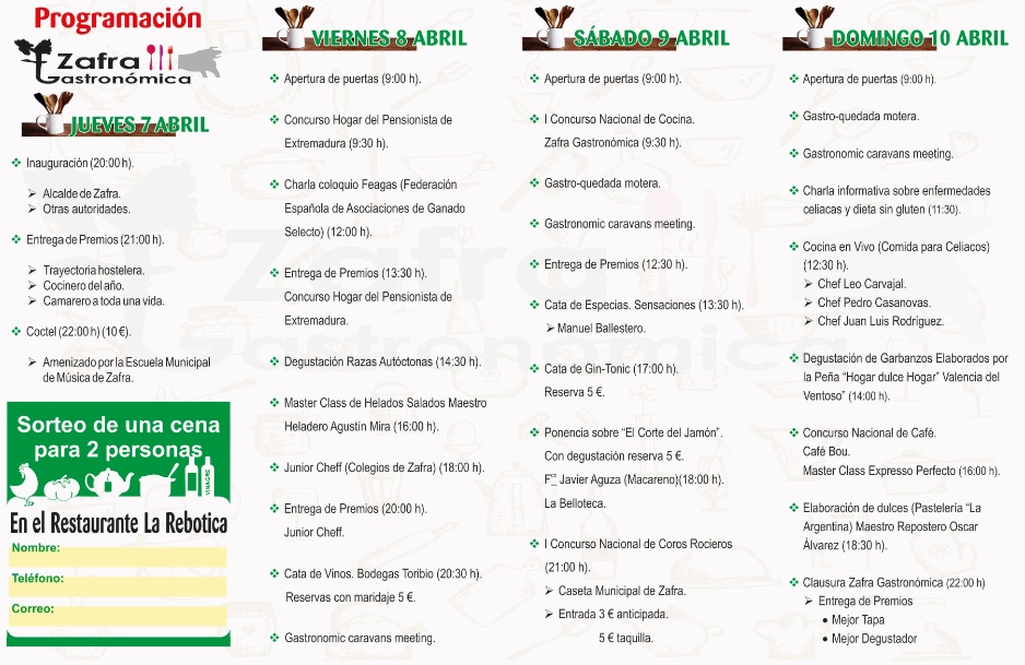A lo largo de las cuatro jornadas de feria se realizarán distintas actividades para impulsar la gastronomía local y promocionar la cocina y los productos extremeños. El domingo 10 de abril se celebrará el acto de clausura con la entrega de premios a la mejor tapa de Cordero de Extremadura y al mejor degustador.