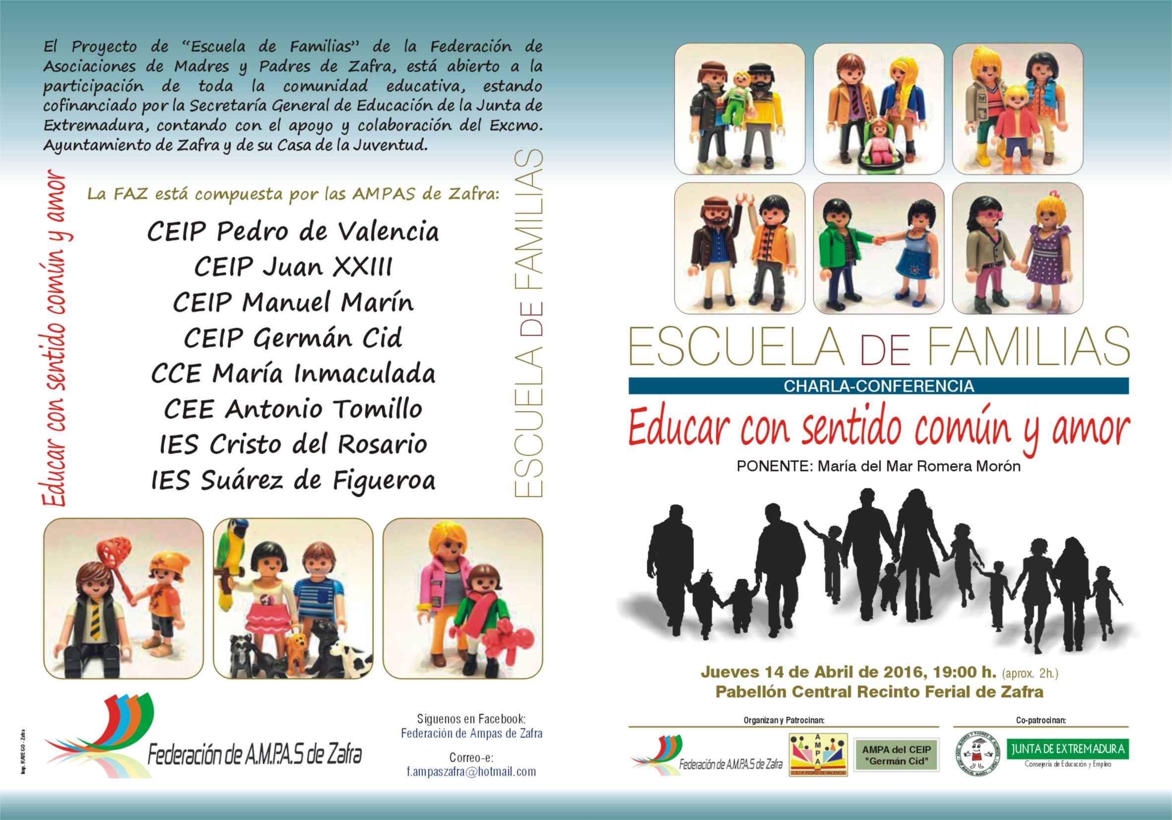 “Educar con Sentido Común y Amor” es una charla impulsada desde las AMPAs de los colegios Pedro de Valencia y Manuel Marín y en la que colaboran el resto de asociaciones de madres y padres de los distintos centros educativos de la ciudad. Está cofinanciada por la Secretaría General de Educación de la Junta de Extremadura, contando con el apoyo y colaboración del Ayuntamiento de Zafra y de su Casa de la Juventud.