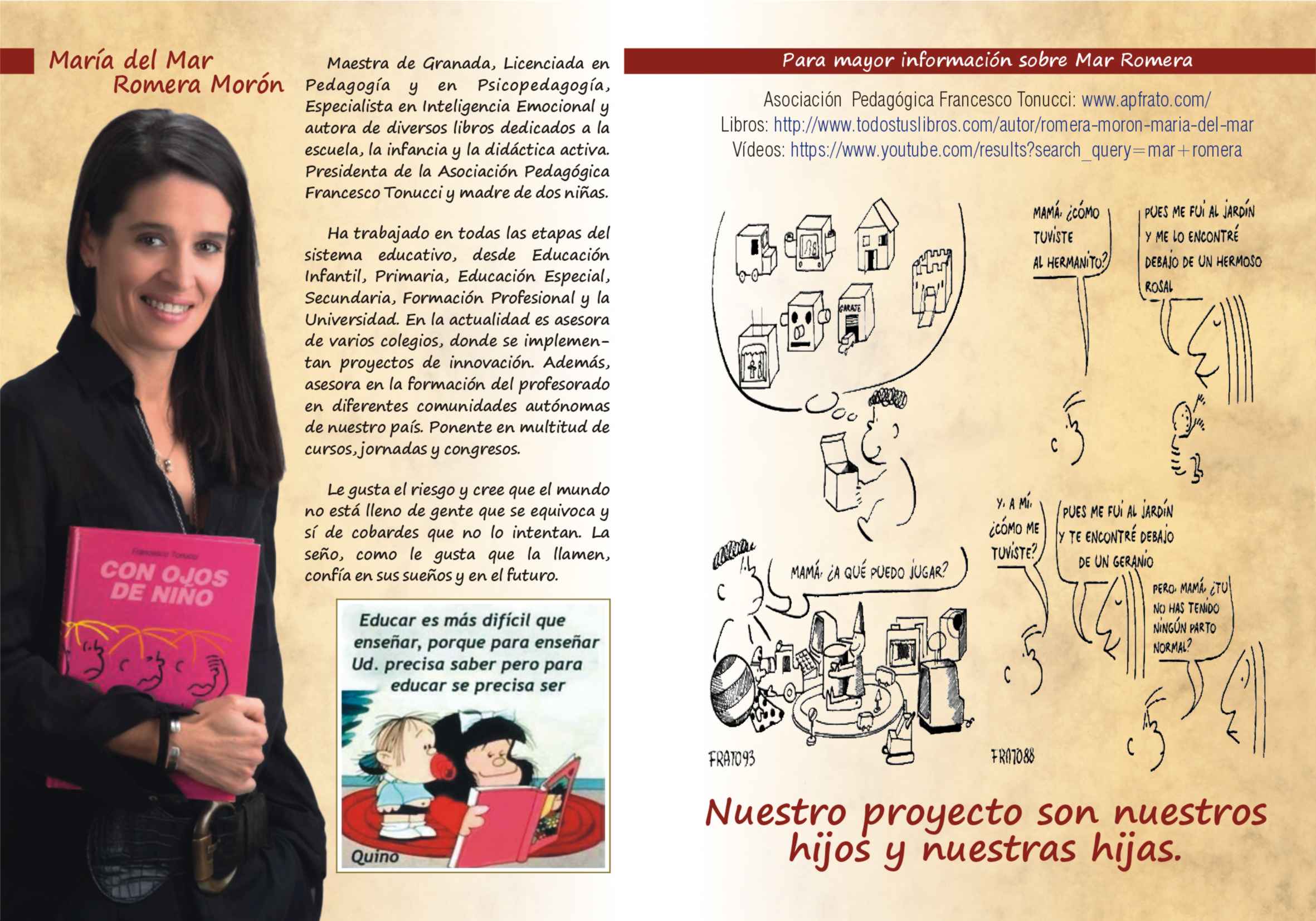 María del Mar Romera Morón es maestra de Granada, licenciada en Pedagogía y en Psicopedagogía, especialista en inteligencia emocional y autora de diversos libros dedicados a la escuela, la infancia y la didáctica activa. Es también presidenta de la Asociación Pedagógica Francesco Tonucci y madre de dos niñas. Ha trabajado en todas las etapas del sistema educativo, desde Educación Infantil, Primaria, Educación Especial, Secundaria, Formación Profesional y la Universidad.