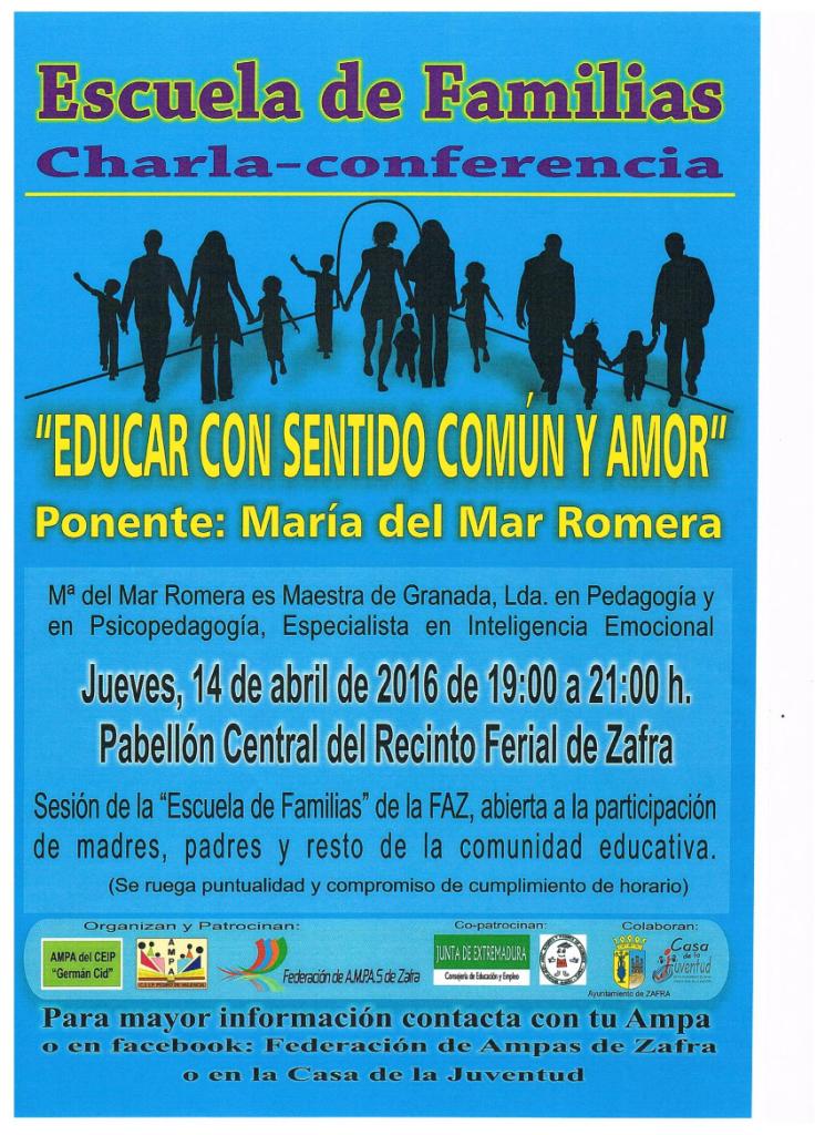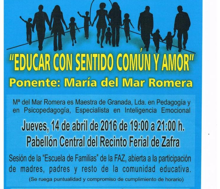 La Federación de AMPAS, en colaboración con la Casa de la Juventud y el Ayuntamiento de Zafra, han organizado una charla- coloquio bajo el título “Educar en Sentido Común y Amor” a cargo de la especialista en inteligencia emocional María del Mar Romera. Tendrá lugar el próximo 14 abril de 19:00 a 21:00 horas en el Pabellón Central del Recinto Ferial.