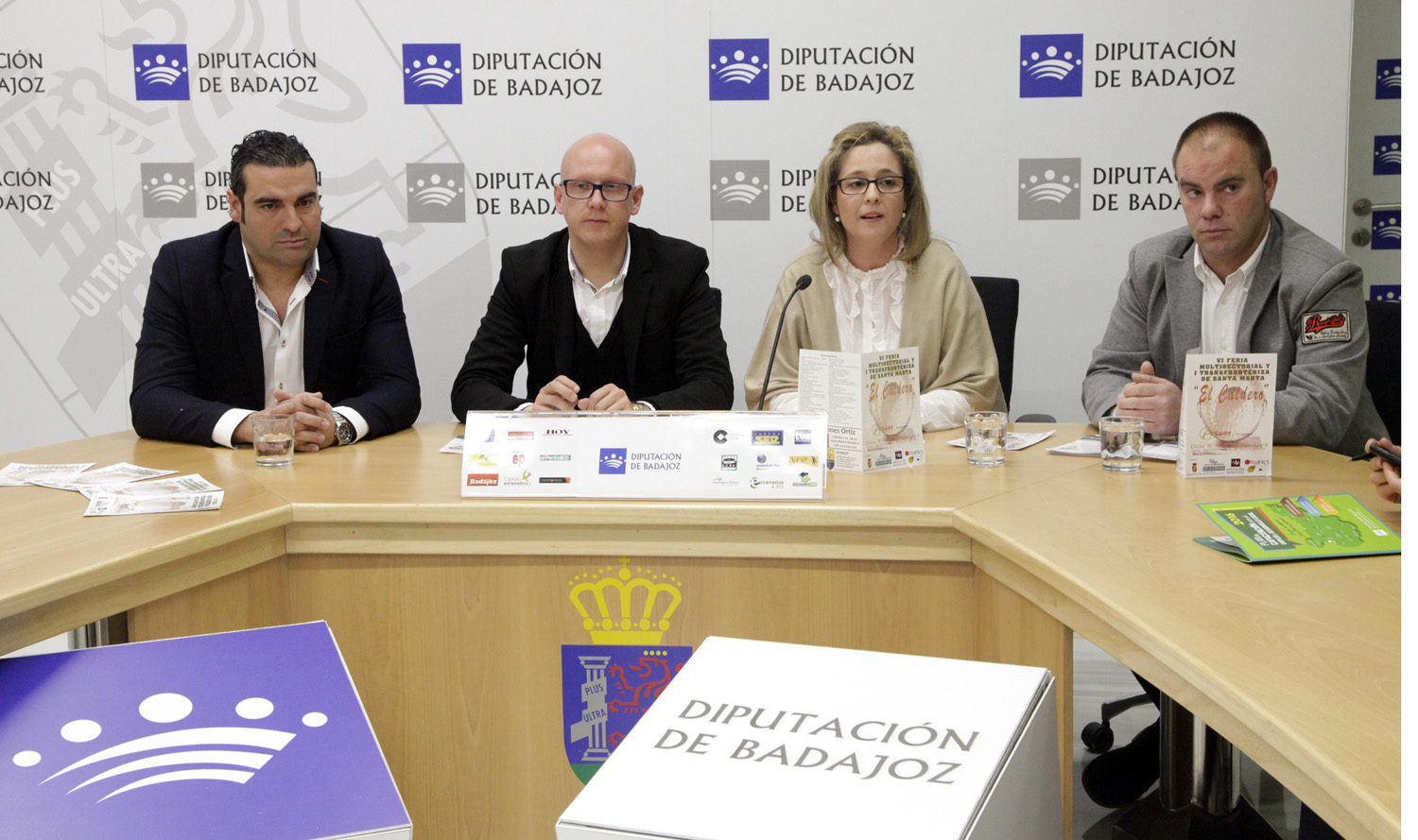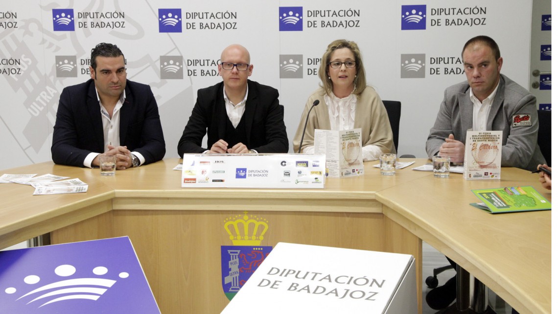 El diputado de Desarrollo Local, José Ángel Benítez, junto con la alcaldesa, Ana Belén Cabañas, y Juan Manuel Cáceres y Celestino Cid en representación de la Asociación de Empresarios de Santa Marta, presentaron hoy el programa de actividades de la Feria que este año alcanza su sexta edición.