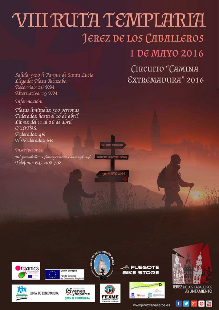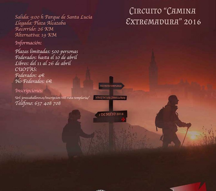 El Club de Senderismo XEREZ en colaboración con el Excmo. Ayto. de Jerez de los Caballeros y el patrocinio de diferentes casas comerciales de esta localidad, organizan la “VIII EDICIÓN DE LA RUTA TEMPLARIA” incluida en el Circuito “CAMINA EXTREMADURA 2016”, que se celebrará el próximo día 1 de Mayo de 2016, a partir de las 9:00 horas.