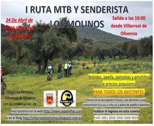 La Comisión de Festejos de Villarreal tiene abierta la inscripción para la I Ruta MTB y senderista ‘Los Molinos’ que realizará el domingo 24 de abril en colaboración con el Ayuntamiento de Olivenza y el club MTB Os Pelinhas.