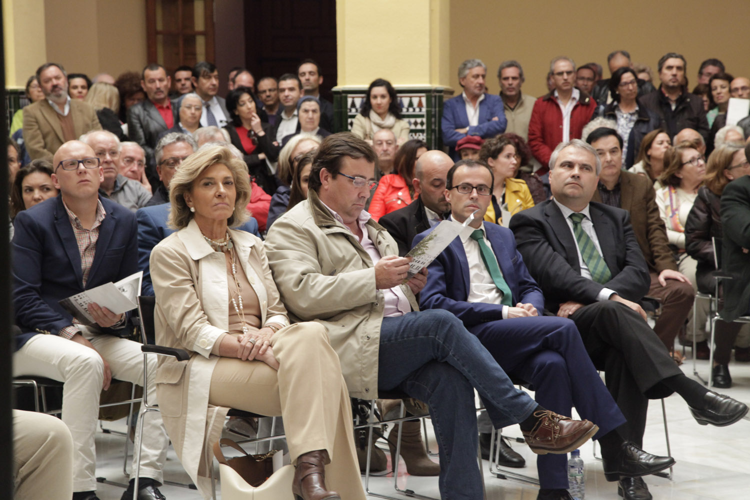 El presidente de la Diputación de Badajoz, Miguel Ángel Gallardo, junto al presidente de la Junta de Extremadura, Guillermo Fernández Vara, el alcalde de Badajoz, Francisco Javier Fragoso Martínez, y los arquitectos Julián Prieto, Daniel Jiménez y Jaime Olivera, que forman parte del equipo técnico que ha redactado el proyecto, han asistido esta tarde, entre otras autoridades y ciudadanos de la ciudad, a la presentación pública del Plan Director del Hospital de San Sebastián.