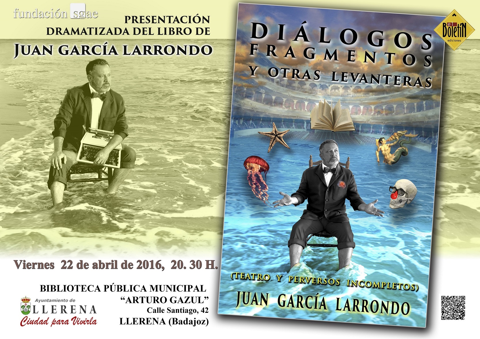 Además de contar con la colaboración del bibliotecario Francisco J. Mateos Ascacibar, en la presentación se estrenará también un podcast a modo de teatro radiofónico de la pieza breve “Seré Isla”, incluida en el volumen, que ha sido elaborado por los alumnos de ESO y Bachillerato del IES “Llerena” que forman parte del Taller de Expresión Oral coordinado por la profesora Inmaculada Coronado. El evento, en el que García Larrondo presenta por primera vez su obra a sus “paisanos” extremeños, estará conducido por la doctora e investigadora Désirée Ortega Cerpa, autora del divertido estudio preliminar del libro, cuyos ejemplares podrán adquirirse en la misma Biblioteca gracias a la cortesía de Imprenta Grandizo y ser firmados por el autor a todos los que se muestren interesados.