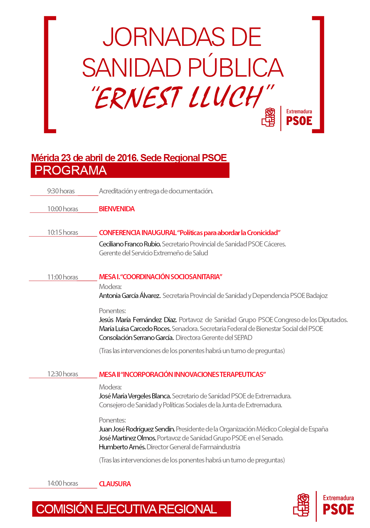 Coincidiendo con el 30 aniversario de la aprobación de la Ley General de Sanidad, el PSOE de Extremadura celebra mañana sábado, 23 de abril la cuarta edición de la Jornada de la Sanidad Pública “Ernest Lluch” en su sede regional en Mérida.