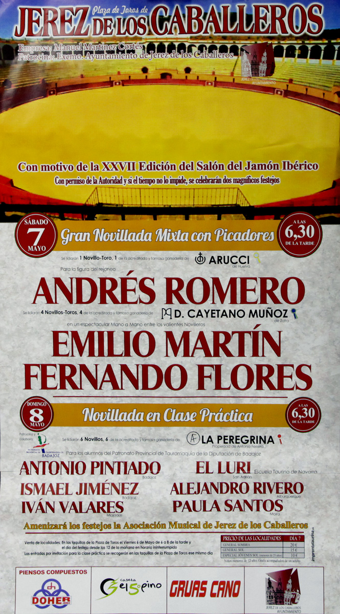 Jerez de los Caballeros ha programado para los días 7 y 8 de mayo sendos festejos taurinos con alumnos de la Escuela de Badajoz, entre ellos Paula Santos, natural de Moira (Portugal), y un novillero de Navarra. Para el día 7, la terna del cartel está compuesta por el rejoneador onubense, Andrés Romero, y los antiguos alumnos pacenses Emilio Martín, natural de Jerez, y del turismo”.