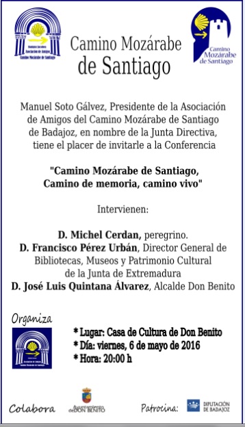 La Asociación Camino Mozárabe de Santiago organiza una conferencia en Don Benito el 6 de mayo Compartir noticia en: Infoprovincia — mayo 3, 2016 Para más información, pulsen sobre las siguientes imágenes: