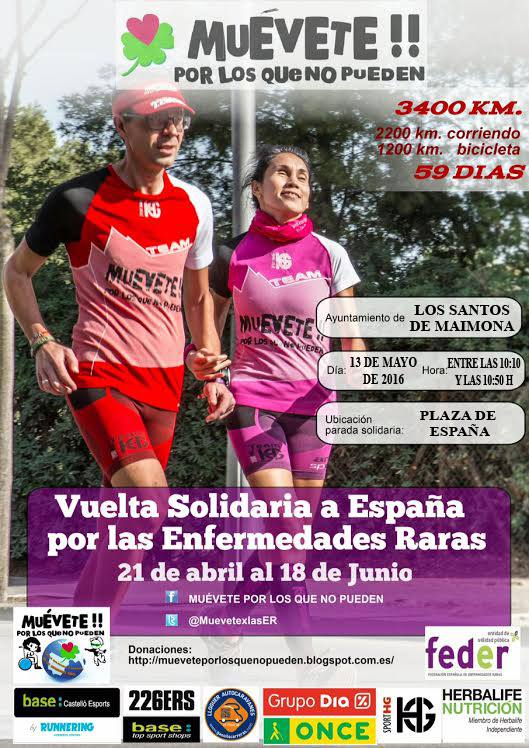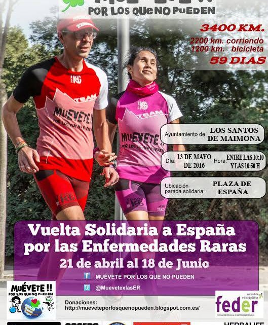 La Vuelta Solidaria a España en favor de las enfermedades minoritarias llegará este viernes 13 de mayo a Los Santos de Maimona con parada solidaria en la Plaza de España, el horario será entre 10:10 a 10:50, por lo que todos los vecinos y vecinas que lo deseen podrán mostrar su apoyo a este extraordinario reto.