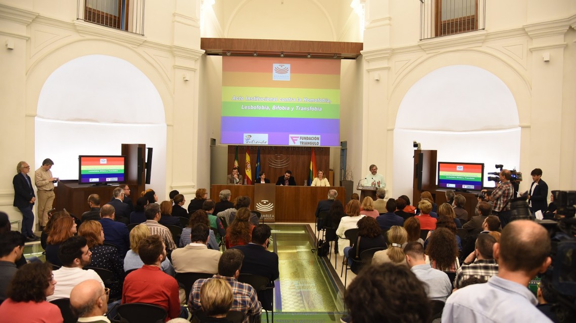 La Asamblea de Extremadura ha acogido esta mañana en la Sala de la Autonomía el acto institucional con motivo del Día Internacional contra la Homofobia, Lesbofobia, Bifobia y Transfobia. La presidenta de la Cámara regional, Blanca Martín, ha dado la bienvenida a los asistentes y ha pedido que “entre todos demos hoy un grito de igualdad en esta región”.