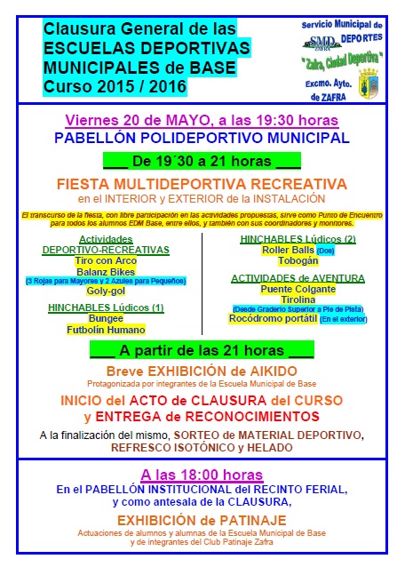 Las Escuelas Deportivas Municipales de Base de Zafra se clausuran mañana viernes día 20 de mayo, de 19:30 a 21 horas, en el Pabellón Polideportivo Municipal. Durante este tiempo habrá una fiesta multideportiva recreativa, sorteos de material deportivo y exhibiciones de las Escuelas Municipales.