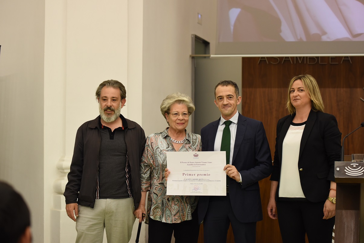 Marabel Matos ha recibido el premio de la mano de Isabel Velayos, viuda del que fuera primer presidente de la Asamblea de Extremadura, Antonio Vázquez, y su hijo y diputado regional en la presente legislatura, Hugo Vázquez.