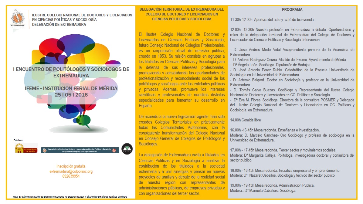 El I Encuentro de Politólogos y Sociólogos de Extremadura tendrá lugar el miércoles 25 de mayo de 2016 a partir de las 11 horas y estará presentado por el vicepresidente primero de la Asamblea de Extremadura, José Andrés Mendo y por el alcalde de Mérida, Antonio Rodríguez Osuna.