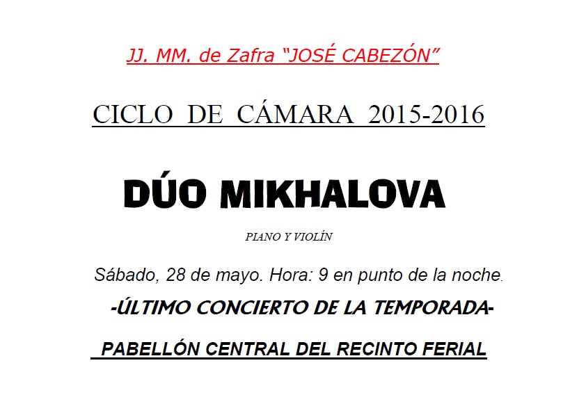 El piano y el violín del Dúo Mikhalova cerrarán la temporada de Juventudes Musicales de Zafra el 28 de mayo Compartir noticia en: Infoprovincia — mayo 23, 2016