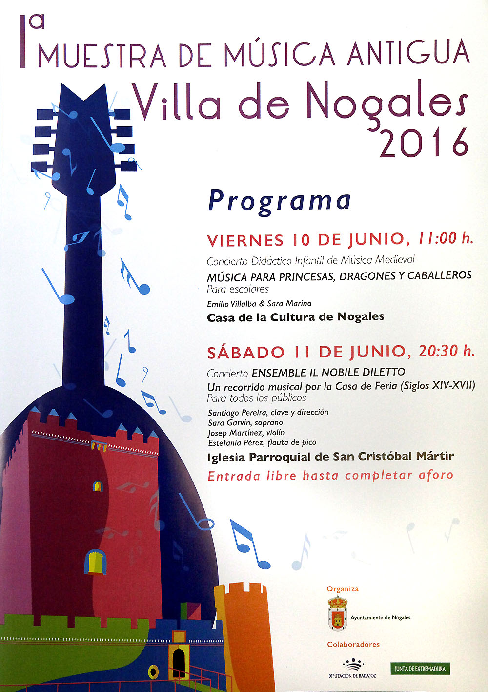“Ensemble Il Nobile Diletto” presentará un programa centrado en la música que se escuchaba en la época de la fundación de la villa de Nogales por Lorenzo Suárez de Figueroa. Comprende músicas de los siglos XIV al XVI con obras de Diego Ortíz, Francisco Guerrero, Juan de la Encina o Juan Vázquez, además de varios anónimos. El programa, denominado “El linaje de Lorenzo Suárez de Figueroa y la música de su tiempo: un recorrido musical por los inicios de la Casa de Feria.