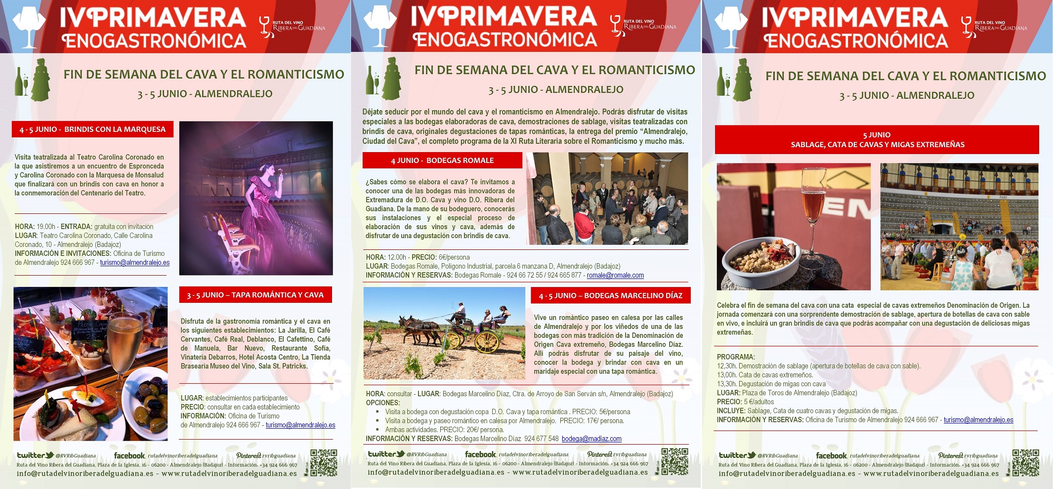 Del 3 al 5 de junio tendrá lugar en Almendralejo el Fin de Semana del Cava y el Romanticismo, una de las actividades de la Primavera Enogastronómica en la Ruta del Vino Ribera del Guadiana, en la que se podrá disfrutar de visitas a bodegas elaboradoras de cava; demostraciones de sablage; visitas teatralizadas con brindis de cava y degustaciones de tapas románticas. También se entregará del premio “Almendralejo Ciudad del Cava y la XI Ruta Literaria sobre el Romanticismo.