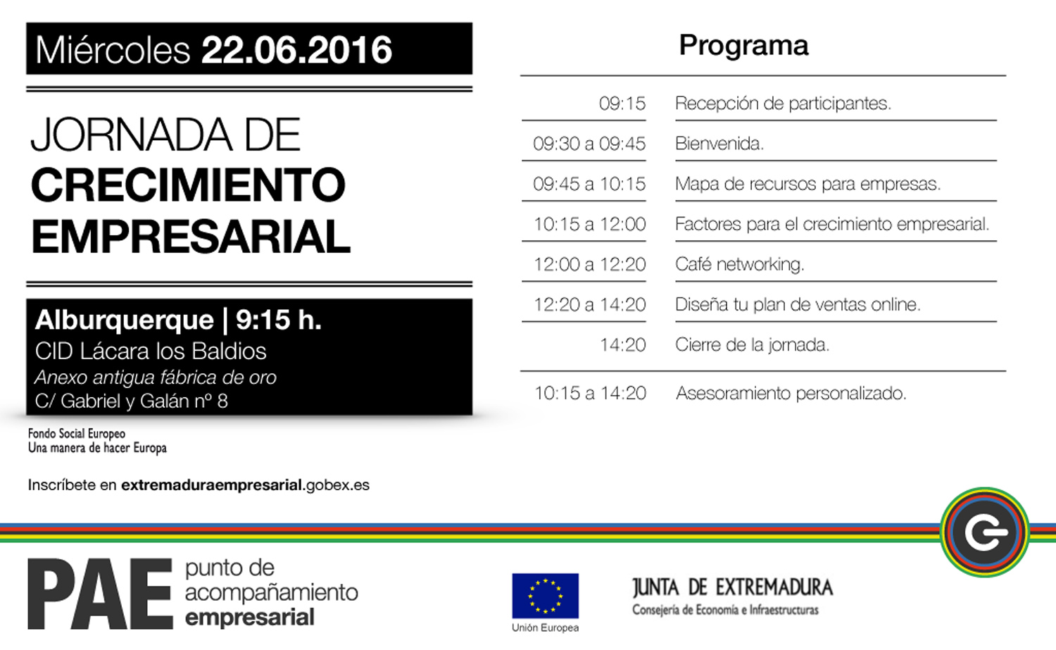 El Punto de Acompañamiento Empresarial Móvil- PAE MV celebra el 22 de junio una Jornada de Crecimiento Empresarial en la localidad de Alburquerque (Centro Integral de Desarrollo Lácara-Los Baldíos: Calle Gabriel y Galán, Nº 8).