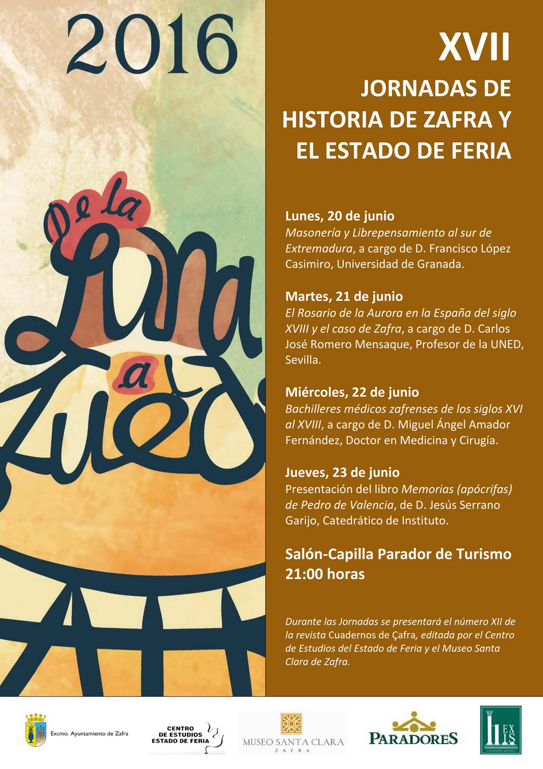 Las XVII Jornadas de Historia de Zafra y el Estado de Feria incluidas en la programación de “De la Luna al Fuego” 2016 comienzan este lunes 20 de junio y se prolongarán hasta el próximo jueves 23. Estas sesiones, como viene siendo habitual, se celebrarán en el salón-capilla del Parador Duques de Feria a partir de las 21:00 horas.