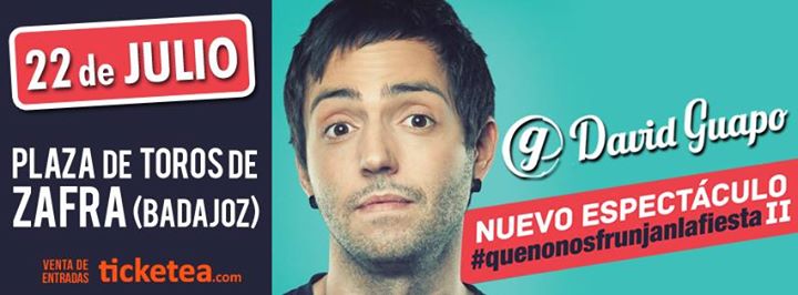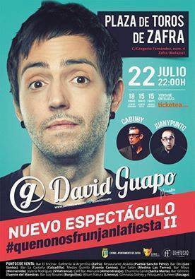 El próximo 22 de julio en la plaza de Toros de Zafra a las 22 horas tendrá lugar el nuevo espectáculo de David Guapo. Además, los asistentes también podrán disfrutar de los humoristas teloneros Cabuby y Juanypunto.