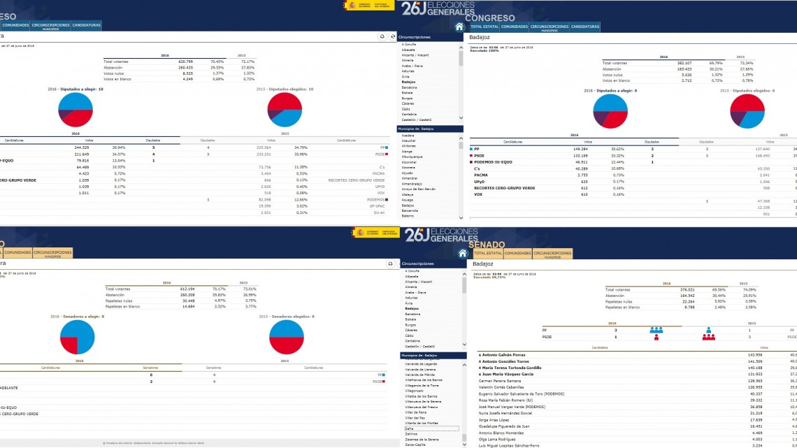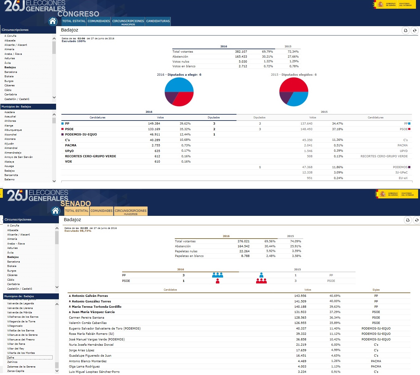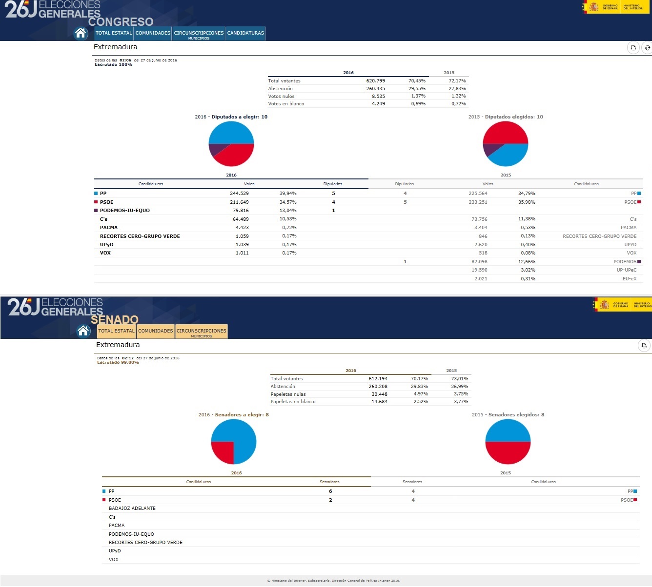 Resultados oficiales Elecciones Generales 26 junio Congreso y Senado en Extremadura y provincia de Badajoz Compartir noticia en: Infoprovincia — junio 27, 2016 Congreso y Senado en Extremadura: Congreso y Senado en la Provincia de Badajoz: