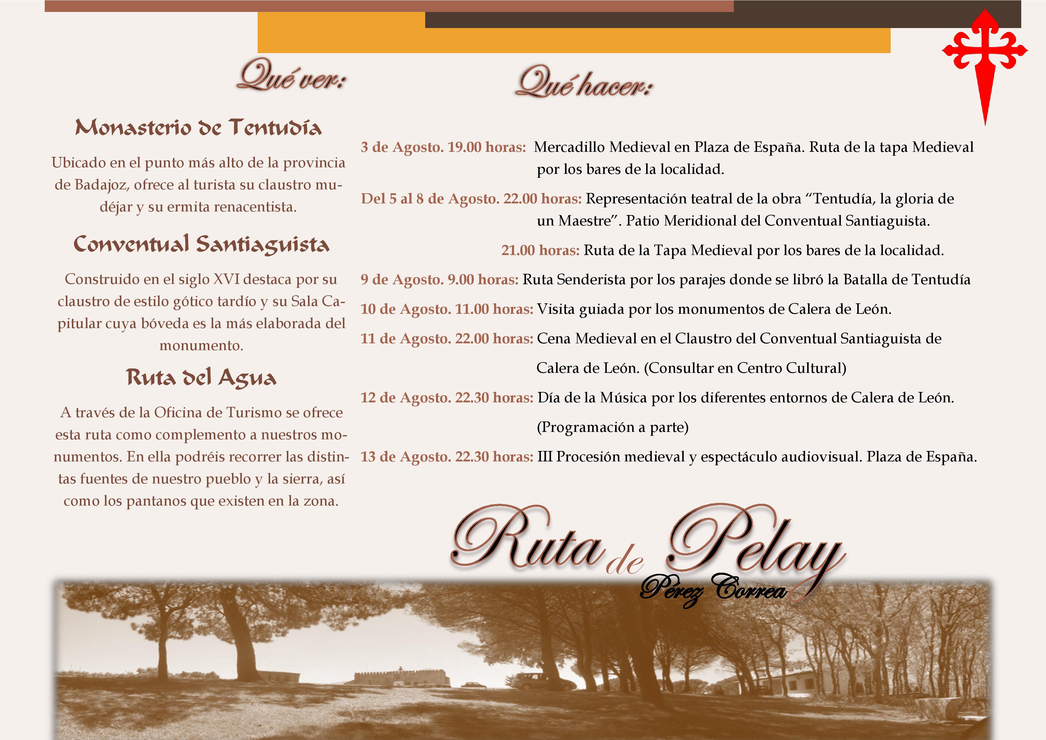Del 3 al 13 de agosto se llevará a cabo la Ruta de Pelay Pérez Correa en Calera de León, dentro de la programación cultural que se organiza desde la Concejalía de Festejos, Cultura y Turismo del Ayuntamiento de Calera de León.