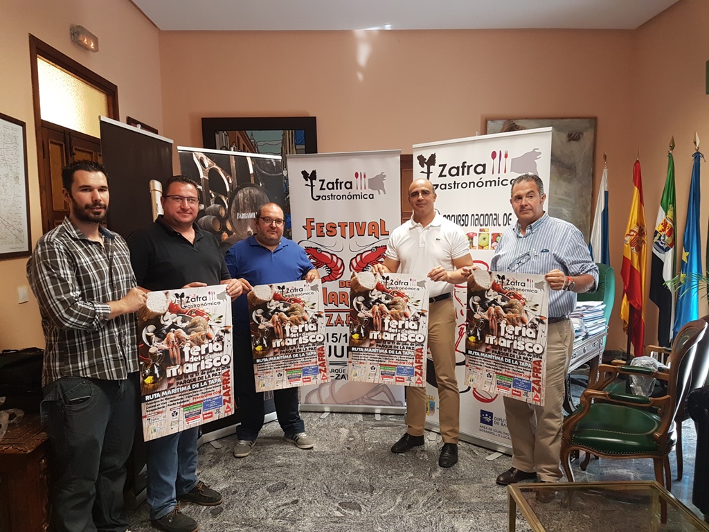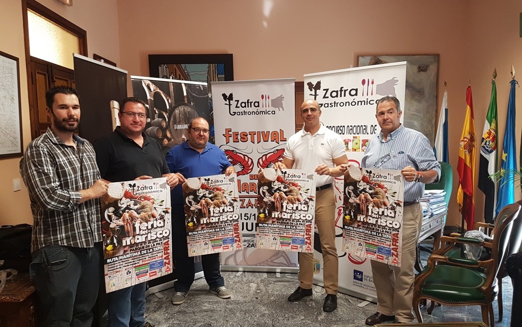 El alcalde de Zafra, José Carlos Contreras, y representantes de la asociación Zafra Gastronómica, presentaron la I Feria del Marisco de Zafra, que incluye diversas actividades relacionadas con este producto. Un certamen que se desarrollará durante los días 15, 16 y 17 de julio y contará con la colaboración de ocho establecimientos de la localidad.