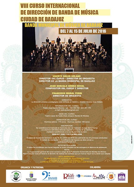 El 15 de julio a las 20 horas en el López de Ayala se desarrollará el Concierto Clausura del VIII Curso Internacional de Dirección de Banda de Música ‘Ciudad de Badajoz’.Banda Municipal de Música de Badajoz.