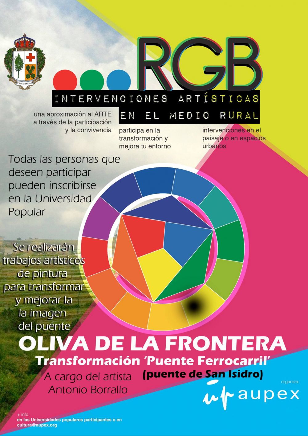 Dentro del programa ‘RGB. Intervenciones artísticas en el medio rural y urbano’ puesto en marcha por AUPEX, se desarrollará una intervención artística en nuestra localidad, concretamente se transformará el Puente del Ferrocarril, más conocido por los habitantes de Oliva como el ‘Puente de San Isidro’, en colaboración de la población y de artistas locales.