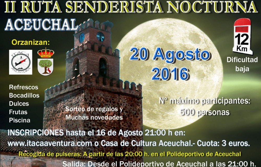 El 20 de Agosto de 2016 (sábado) se celebrará en Aceuchal a partir de las 21:00 h. la II RUTA SENDERISTA NOCTURNA que está organizada por Ítaca Aventuras y el Ayuntamiento de Aceuchal y tendrá un recorrido de 12 kilómetros de baja dificultad.