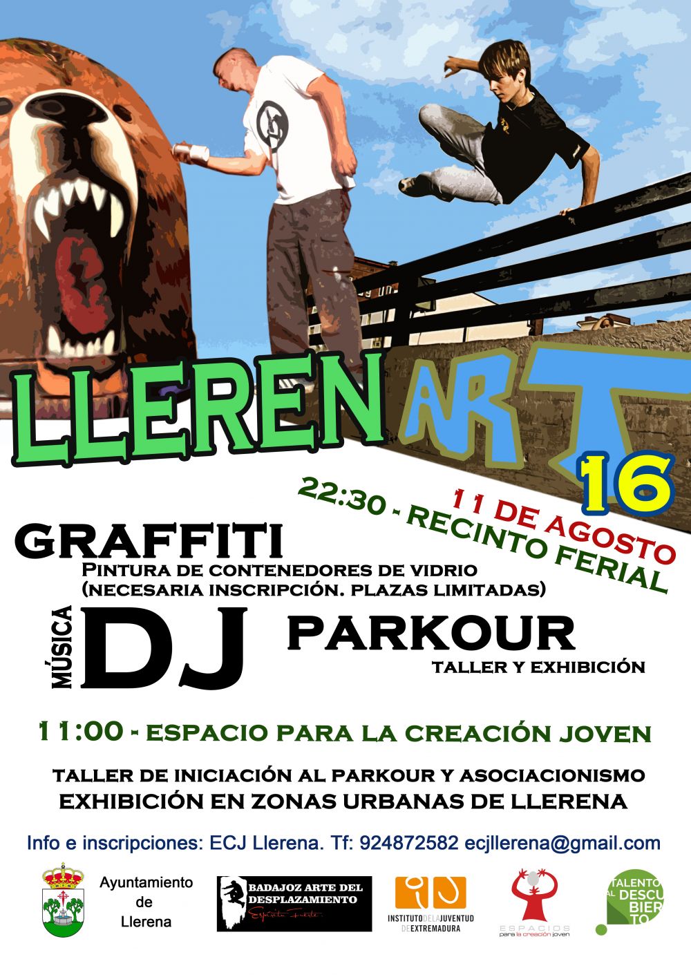 El jueves 11 de agosto se celebra en Llerena la primera edición de LlerenArt. Se trata de una cita pensada para jóvenes aficionados a la cultura urbana en la que la música, el grafiti y el parkour serán los protagonistas. La programación se inicia a las 11hs con un taller de iniciación al parkour y sobre asociacionismo en el Espacio para la Creación Joven. Posteriormente se realizarán una serie de exhibiciones en zonas urbanas de la localidad.