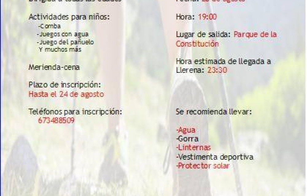 Esta travesía está organizada por Cruz Roja Juventud en Llerena y está dirigida a todas las edades. Está previsto salir a las siete de la tarde desde el Parque de la Constitución y la llegada está estimada para las 23.30hs. La organización recomienda a los participantes llevar gorra, protector solar, ropa deportiva, linternas y agua. Según se ha anunciado, a todos los asistentes se les ofrecerá una cena-merienda al llegar a Casas de Reina y para los más pequeños se han programado además una serie juegos tradicionales.