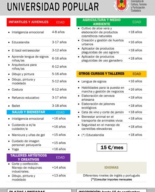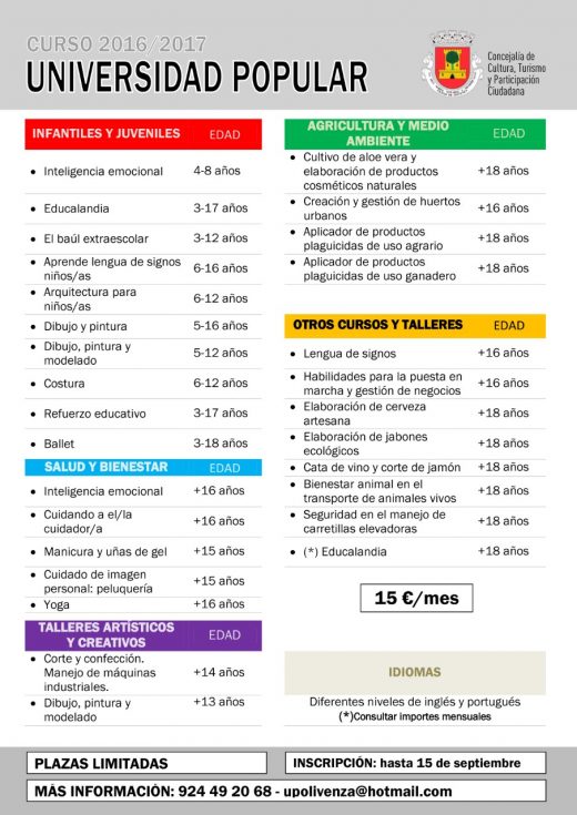 Cartel de las acciones formativas ofertadas por la concejalía de cultura del Ayuntamiento de Olivenza, para el curso (2016-2017) de la UPO.