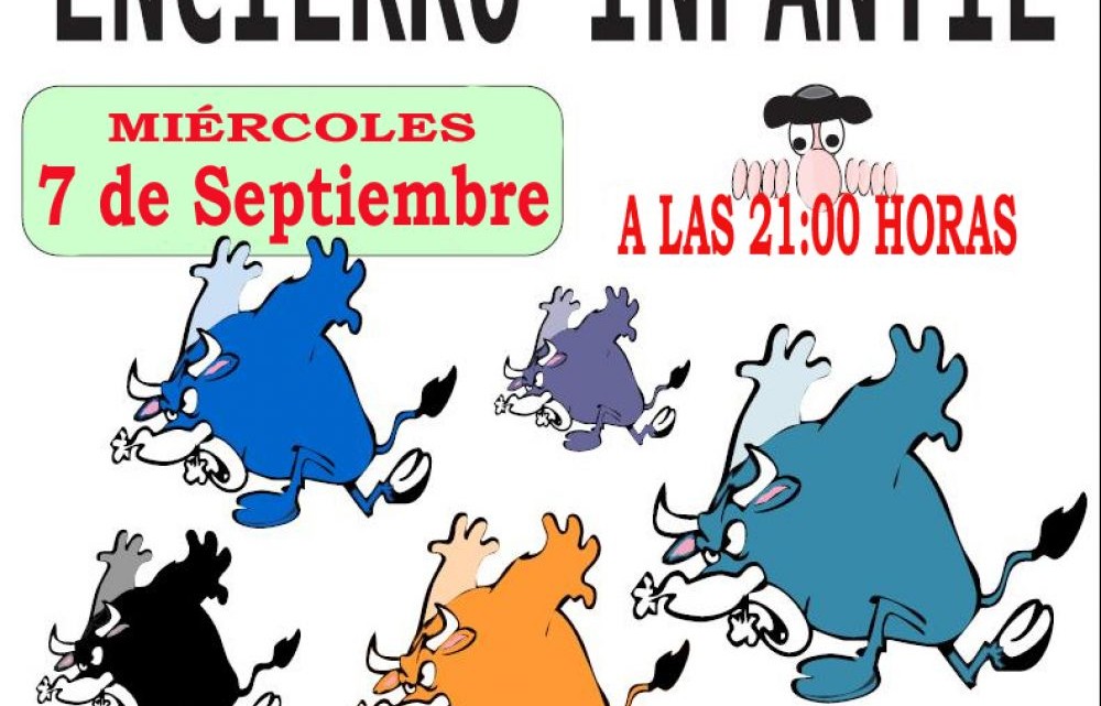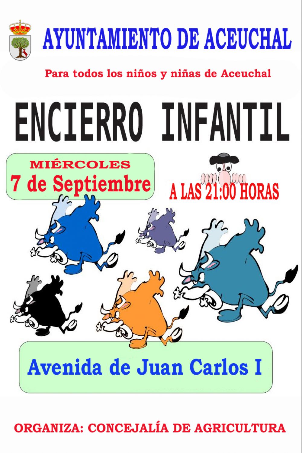 Con motivo de la celebración de las fiestas patronales la Concejalía de Agricultura del Ayuntamiento de Aceuchal organiza para todos los niños y niñas de nuestra localidad un ENCIERRO INFANTIL que se celebrará el día 7 de septiembre a partir de las 21:00 h. en la Avenida de Juan Carlos I.