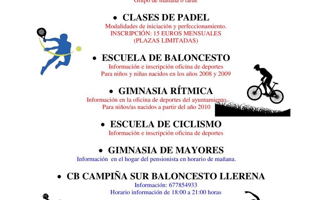 En lo que respecta a la programación para el próximo otoño – invierno, directamente desde el Ayuntamiento se ha previsto gimnasia de mantenimiento en grupos de mañana y tarde; clases de pádel de iniciación y perfeccionamiento; escuela de baloncesto para niños y niñas nacidos en los años 2008 y 2009; gimnasia rítmica para niños y niñas nacidos hasta el 2010 y la escuela de ciclismo. Las inscripciones deben formalizarse en la Oficina de Deportes de lunes a viernes en horario de 10hs a 13hs donde se ofrece también más información sobre cada actividad.