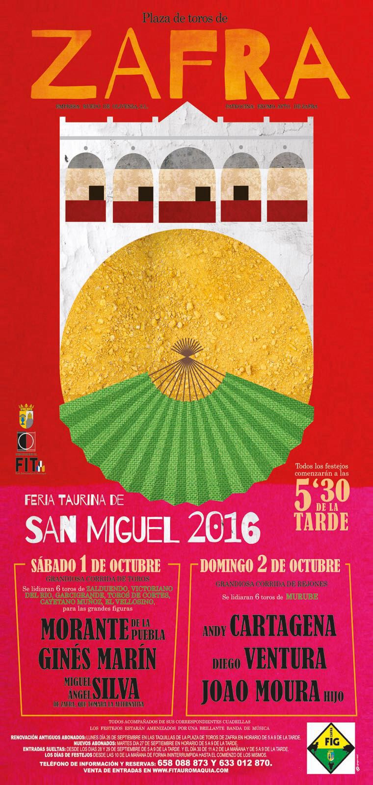 El cartel de la Feria de San Miguel 2016 se abre el día 1 de octubre, a las 17:30 horas, con una corrida a pie con ganado de las ganaderías: Victoriano del Río, Zalduendo, Garcigrande, Cayetano Muñoz, El Vellosino, Toros de Cortés para los diestros: Morante de la Puebla, Ginés Marín y Miguel Ángel Silva en su toma de la alternativa.