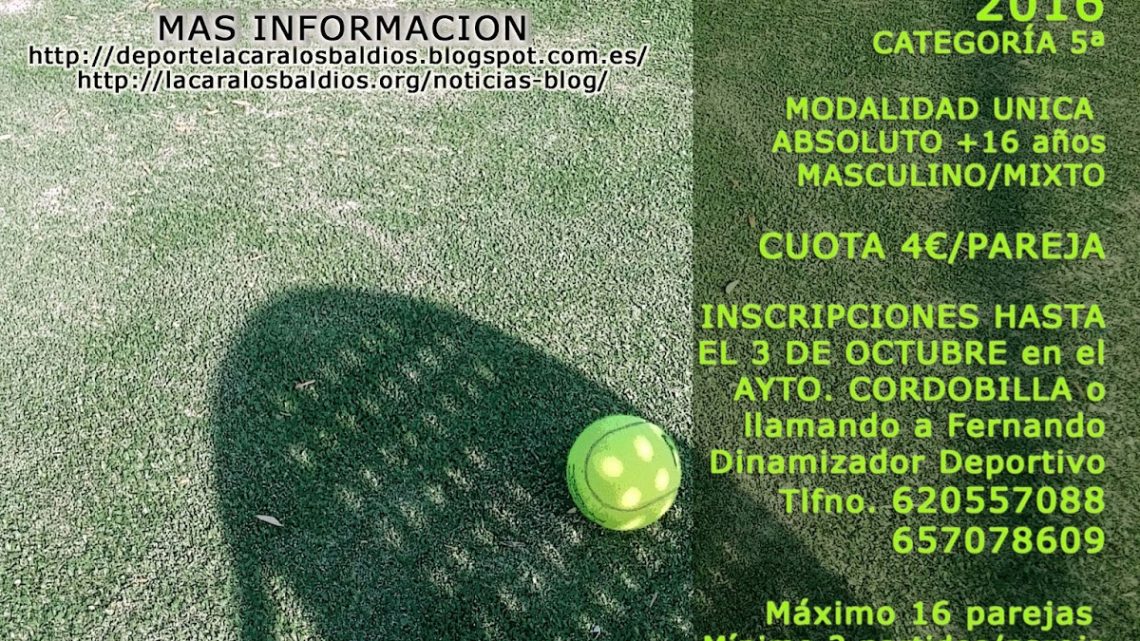 Del 7 al 9 de octubre, en la pista de padel municipal de Cordobilla de Lácara, tendrá lugar este torneo de padel organizado por el Excmo. Ayto. de Cordobilla a través del Servicio de Dinamización Deportiva de la Mancomunidad Lácara los Baldíos, que cuenta con la subvención de la Excma. Diputación de Badajoz. El torneo de 5ª categoría espera reunir a jugadores iniciados de los municipios vecinos, para disputar el mayor número de partidos posibles comenzando el viernes por la tarde y terminando el domingo por la noche. Conocedores de la ocupación laboral de los vecinos, la mayoría de los cuales trabajan los sábados por la mañana, se han programado los encuentros de este torneo sin contar con la mañana del sábado,  con objeto de facilitar la máxima participación. El grueso de la competición se centrará en el sábado tarde y todo el domingo. El sistema de competición quedará determinado por el número de parejas, para lo que se ha establecido un máximo de 16, si bien en el peor de los casos se concederá a todas ellas un mínimo de dos partidos, uno de competición y al menos otro de consolación.