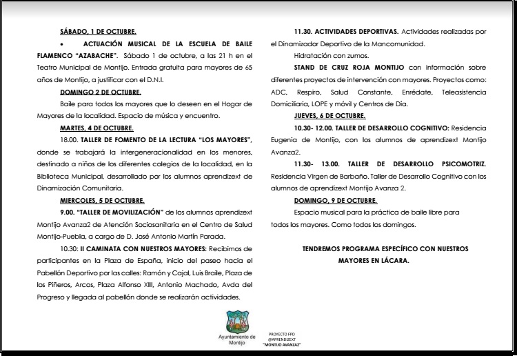 Desde el Ayuntamiento de Montijo, a través de la Concejalía de Bienestar Social, Mayores y Sanidad y el proyecto aprendizext Montijo Avanza2 se ha desarrollado la programación de actividades de la Semana del Mayor. Una programación donde se realizan actividades para los mayores con actuaciones musicales, de ocio y diversión, deportivas entre otras y un bloque de actividades formativas para los profesionales que van a dedicar su carrera profesional a este colectivo para conseguir una mayor cualificación dentro del sector.