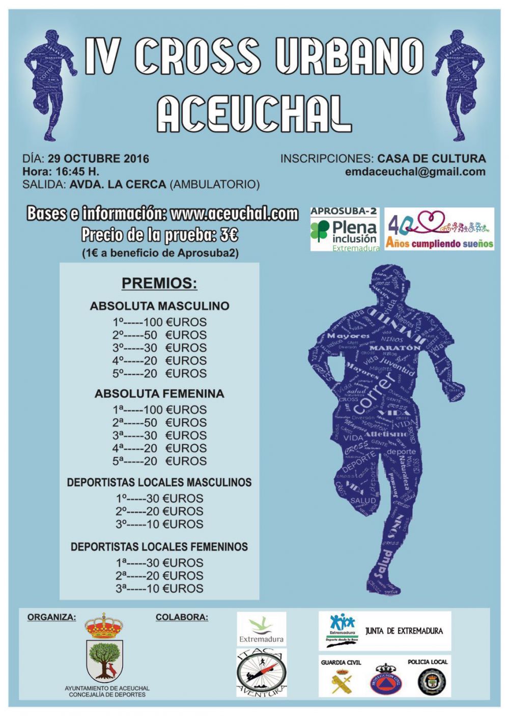 El sábado 29 de Octubre de 2016 se celebrará en Aceuchal la cuarta edición del CROSS URBANO que está organizado por la Concejalía de Deportes del Ayuntamiento de Aceuchal con la colaboración de “Ítaca Aventuras”, Junta de Extremadura, Guardia Civil, Policía Local y Protección Civil.