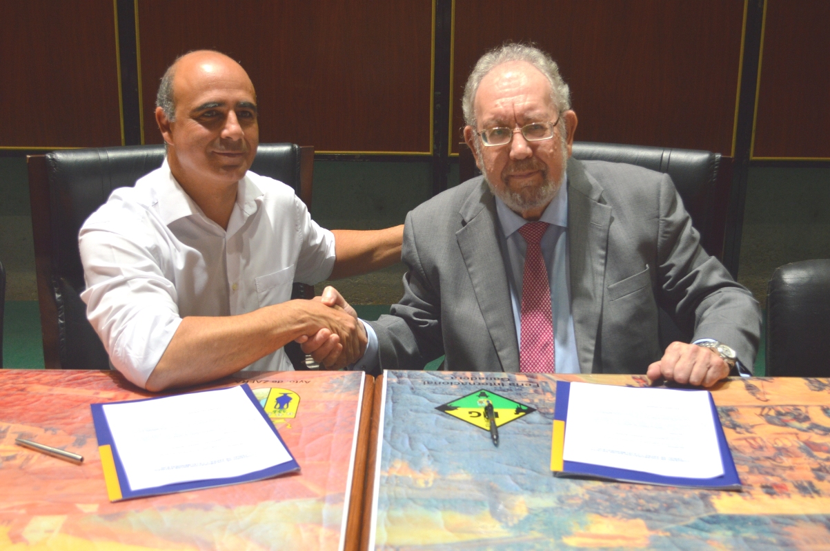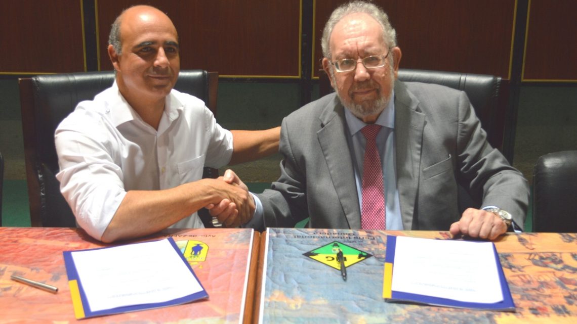 La firma del convenio ha tenido lugar esta mañana en el Pabellón Central del Recinto Ferial y ha contado con la asistencia del alcalde de Zafra y presidente de la Entidad Ferial, José Carlos Contreras y el presidente de Cajalmendralejo, Sebastián Guerrero.