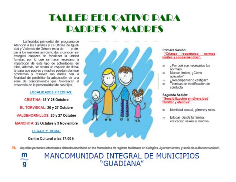La Mancomunidad Integral de Municipios “Guadiana”, va a llevar a cabo durante varias sesiones en el mes de octubre y noviembre, los “Talleres Educativo para Padres y Madres”, dirigidos a familias, AMPA y profesionales del ámbito Socio-Educativo.