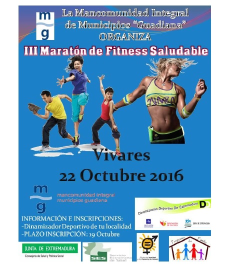 La Mancomunidad Integral de Municipios “Guadiana” a través de sus servicios de Dinamización Deportiva, de la Oficina de igualdad y el programa de familia organizan el próximo 22 de octubre (Sábado) la III Maratón de Fitness Saludable que en esta ocasión se celebrará en la localidad de Vivares.