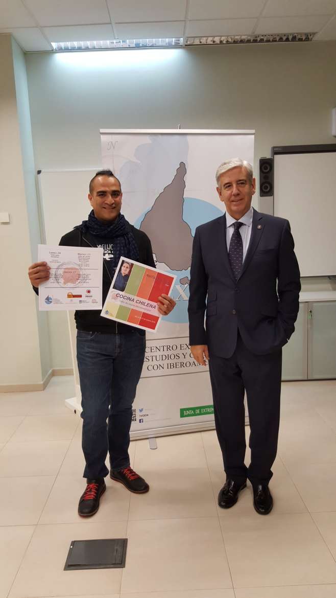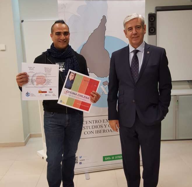 El director académico del Centro Extremeño de Estudios y Cooperación con Iberoamérica (CEXECI), César Chaparro, y el chef chileno Matías Palomo han presentado los talleres formativos y las actividades de exhibición que este reputado cocinero iberoamericano impartirá esta semana en la Escuela Superior de Hostelería y Agroturismo de Extremadura (ESHAEX).
