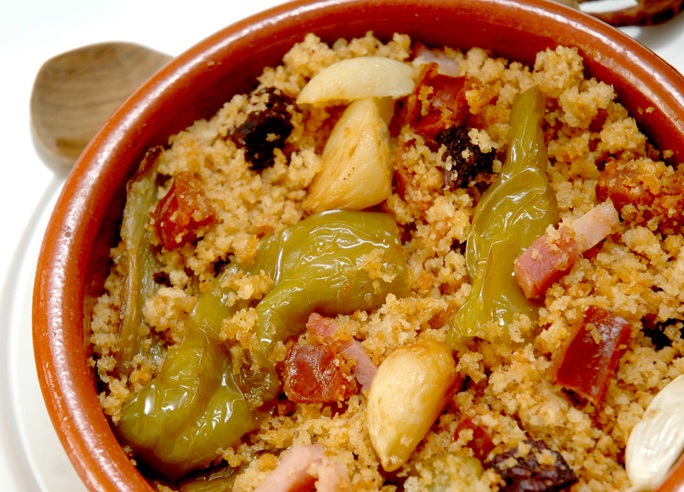 En el aceite que tenemos agregamos el pan y damos vueltas con una espumadera hasta que quede bien impregnado de grasa y que el pan pierda la humedad. Comenzamos a picar el pan, golpeando con la espumadera despacio. Cuando veamos que el pan está bien migado y suelto, incorporamos los ajos, la panceta y el pimiento rojo que teníamos reservados de nuevo a la sartén y continuamos removiendo.