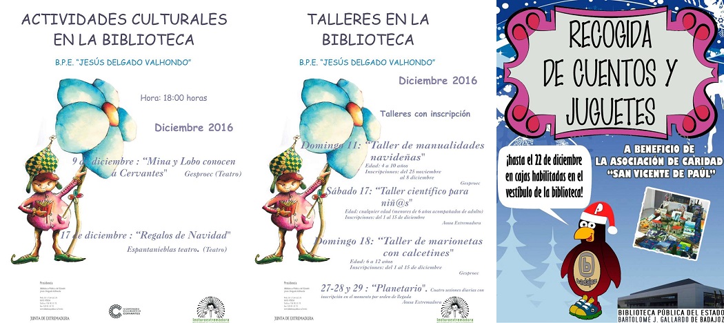 La Biblioteca Pública del Estado “Jesús Delgado Valhondo” de Mérida celebrará diversos talleres durante todo el mes de diciembre. Así, el domingo 11 se llevará a cabo el “Taller de Manualidades Navideñas” dirigido a niños de entre 4 y 10 años. El sábado 17 de diciembre se realizará un Taller científico para niños de cualquier edad. El domingo 18 se organizará un “Taller de marionetas con calcetines” para niños de entre 6 y 12 años. Todos los talleres requieren de inscripción previa.
