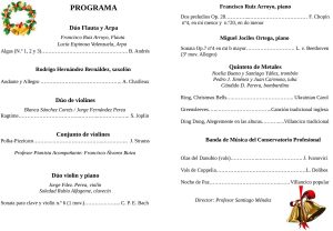 En el Concierto de Navidad alumnos de flauta, arpa, violín, piano, quinteto de metales y la ya citada Banda de Música del Conservatorio interpretarán obras de Strauss, Bach, Chopin, Beethoven o L. Delibes además de algún villancico tradicional.