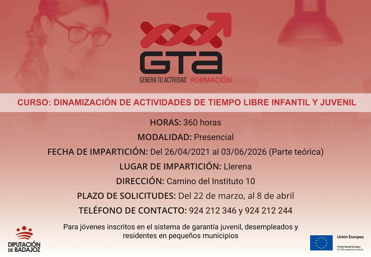La Diputación de Badajoz, a través del Proyecto GTA Formación (Genera Tu Actividad), desarrollado por el Servicio de Capacitación para el Empleo, dependiente del Área de Desarrollo Rural y Sostenibilidad y en colaboración con la Oficina de Proyectos Europeos, va a iniciar un curso de formación de “Dinamización de actividades de tiempo libre infantil y juvenil” en Llerena, perteneciente al territorio CID Campiña Sur.